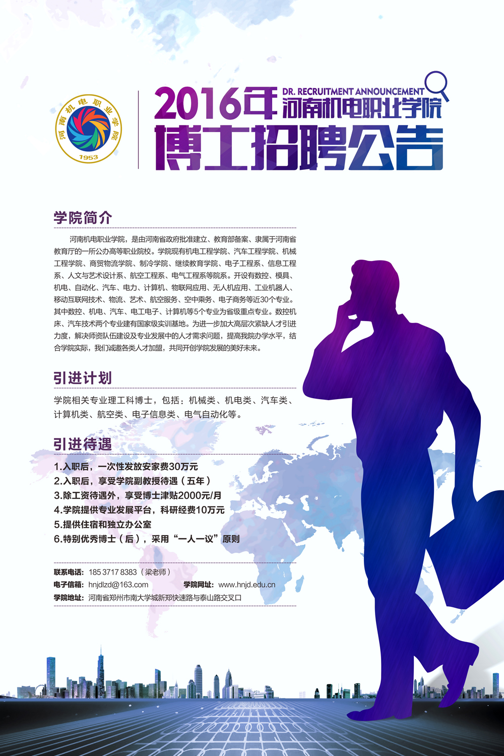 河南机电职业学院(www.hnjd.edu.cn),是由河南省政府批准建立、教育部备案、隶属于河南省教育厅的一所公办高等职业院校。学院现有机电工程学院、汽车工程学院、机械工程学院、商贸物流学院、制冷学院、继教育学院、电子工程系、信息工程系、人文与艺术设计系、航空工程系、电气工程系等院系。开设有数控、模具、机电、自动化、汽车、电力、计算机、物联网应用、无人机应用、工业机器人、移动互联网技术、物流、艺术、航空服务、空中乘务、电子商务等近30个专业。其中数控、机电、汽车、电工电子、计算机等5个专业为省级重点专业。数控机床、汽车技术两个专业建有国家级实训基地。为进一步加大高层次紧缺人才引进力度,解决师资队伍建设及专业发展中的人才需求问题,提高我院办学水平,结合学院实际,我们诚邀各类人才加盟,共同开创学院发展的美好未来。??